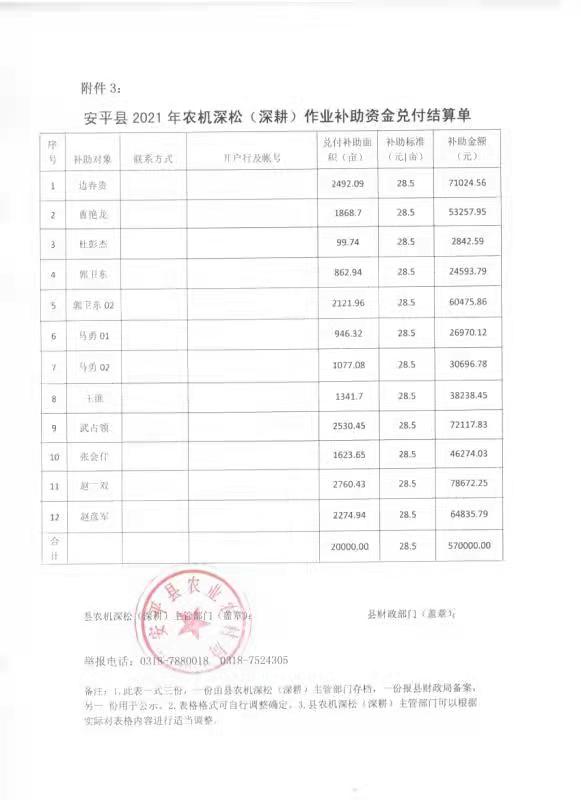 安平县2021年农机深松作业补贴资金兑付结算信息公示