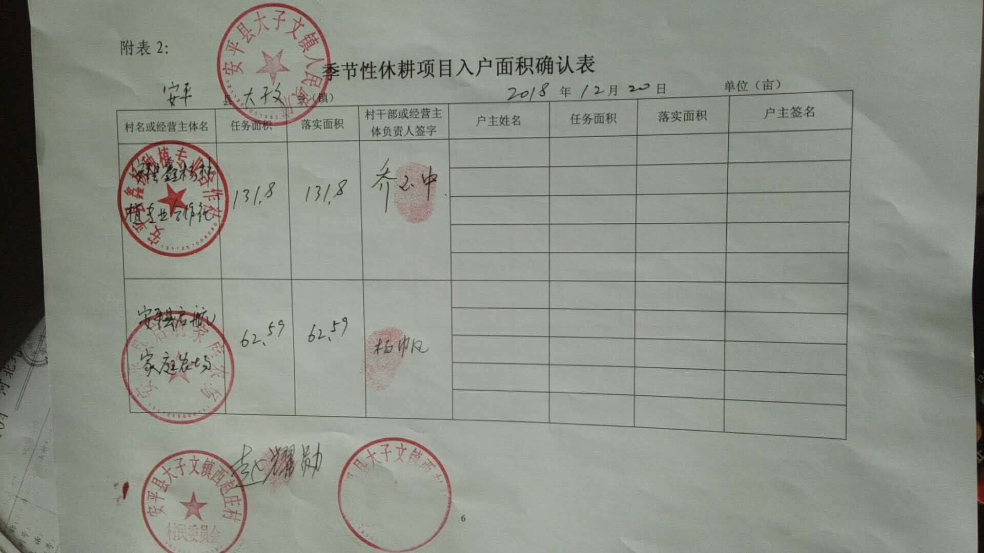2018年度安平县季节性休耕项目任务面积13.3万亩,涉及8个乡镇,按照《安平县2018年度季节性休耕项目验收办法》要求,验收小组对马店镇、油子乡、大子文镇、两洼乡、东黄城镇五个乡镇进行了抽查,验收。验收小组首先听取了项目乡镇主管领导的汇报,查看了项目档案,并按照打分标准进行打分。现场验收采取入户确认、田间实地勘察的方法,每个乡镇随机抽查1-2个村,每个村随机查1-2个经营主体或五户,由乡镇人员、村负责人、经营主体法人 (户主)共同核查落实面积,填写《季节性休耕项目入户面积确认表》,乡镇、村委会、经营主体(户主)确认,签字盖章。