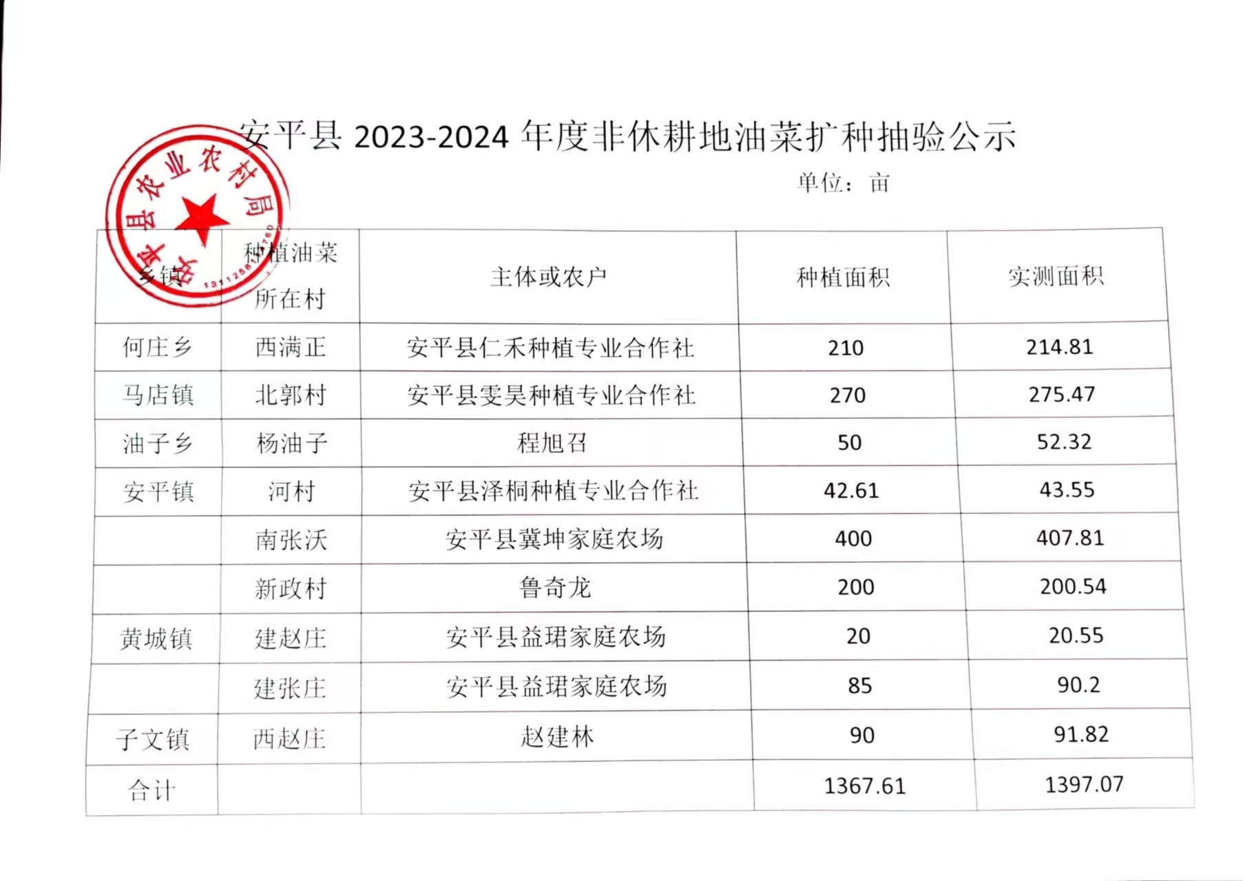 安平县2023-2024年度非休耕地油菜扩种抽验公示