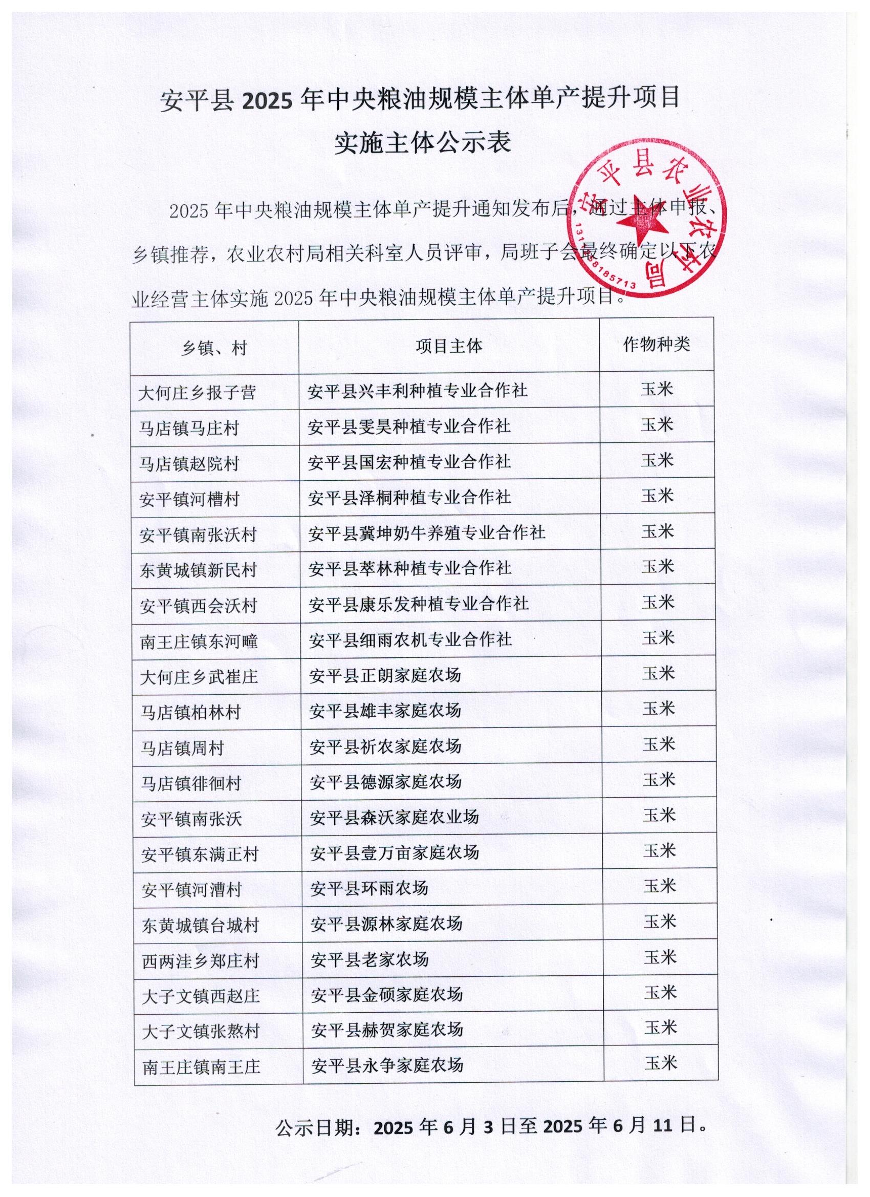 安平县2025年中央粮油规模主体单产提升项目实施主体公示