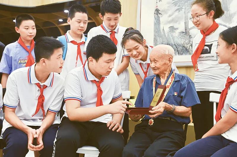 2020年8月23日,安徽省合肥市薛河湾社区举行“听老兵讲故事”爱国主义主题教育活动,少先队员们聆听老兵讲述抗战故事,铭记战争的苦难与胜利的光荣。图为学生们在听九旬老兵施长明讲自己当年的战斗故事。中新社记者 韩苏原/摄