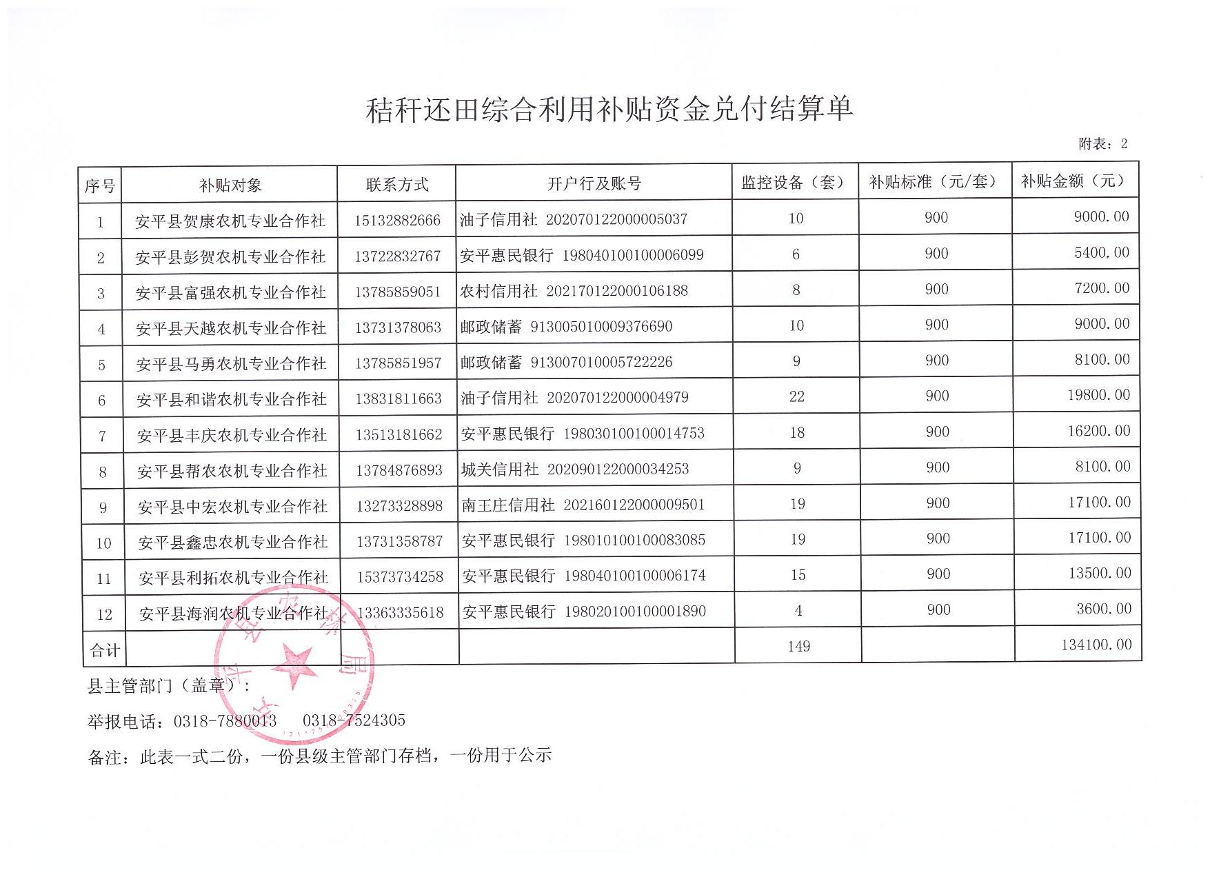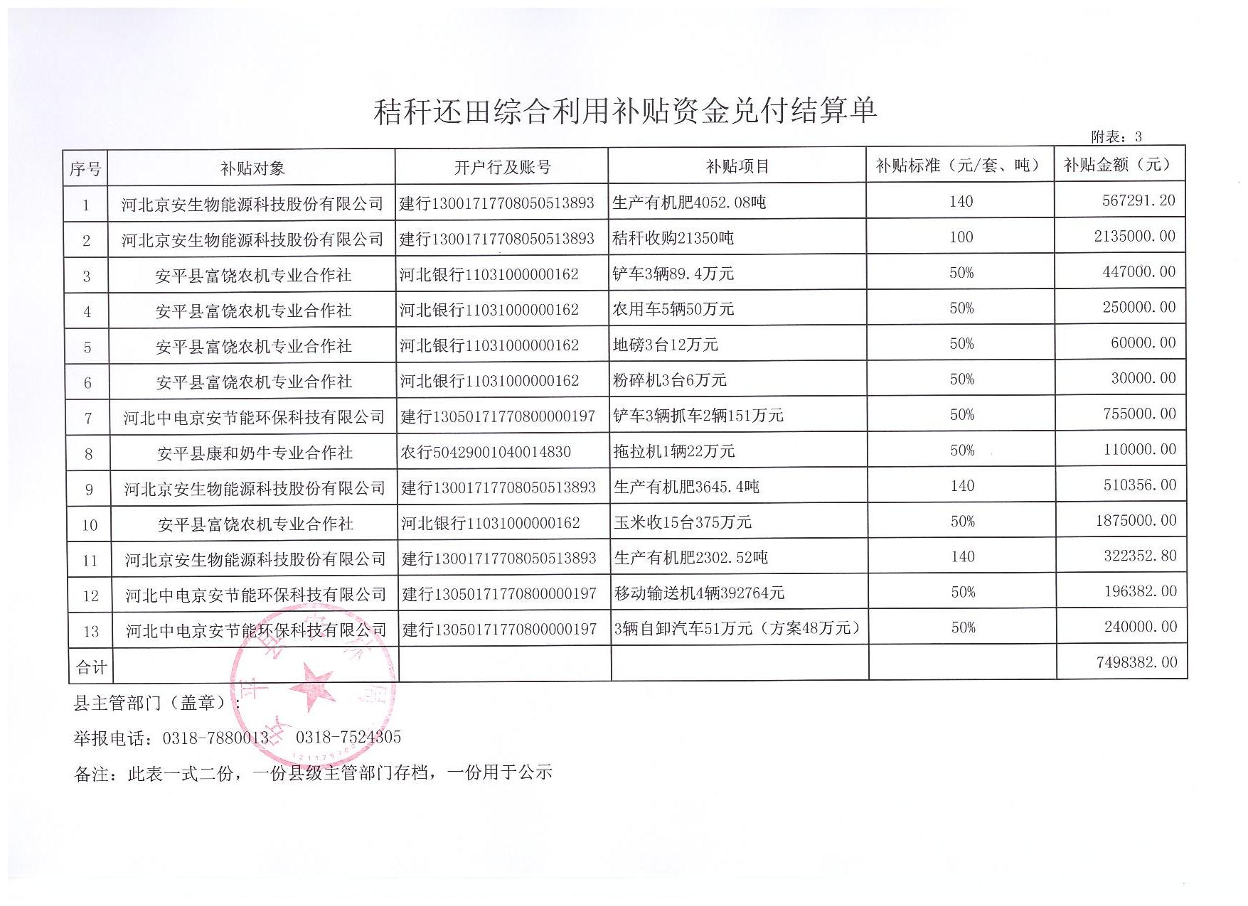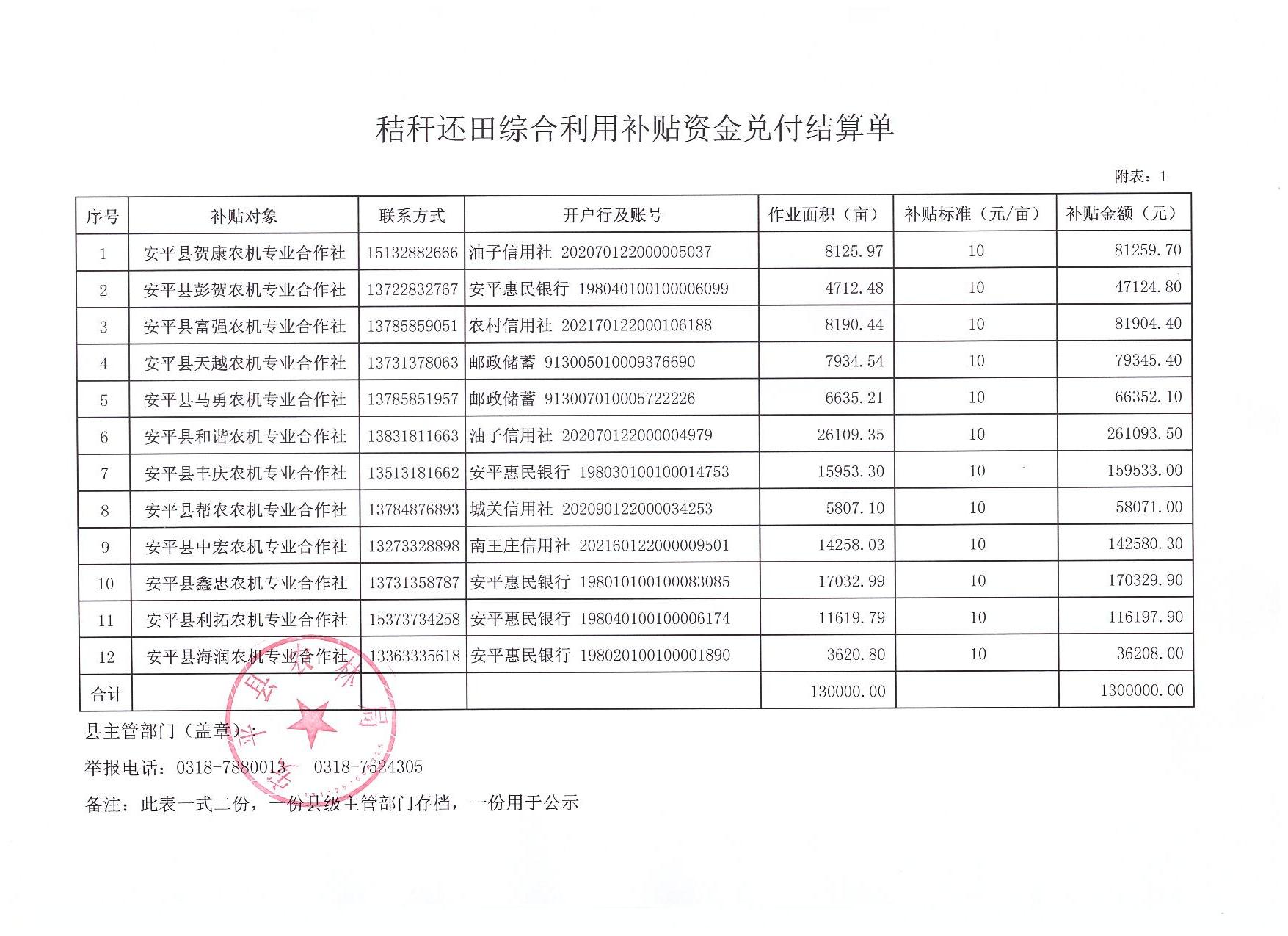安平县2017年农作物秸秆还田利用试点项目资金兑付公示